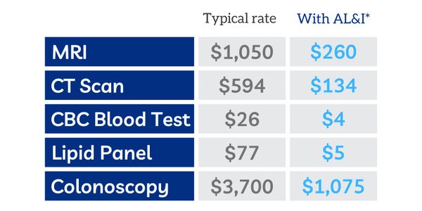 * Rates are bundled rates including physician fee, facility fee and reports. Actual examples for Houston, TX CPT codes for rates quoted 72141(MRI), 70450(CT), 85004(CBC), 80061(Lipid Panel), 45385(Colonoscopy).